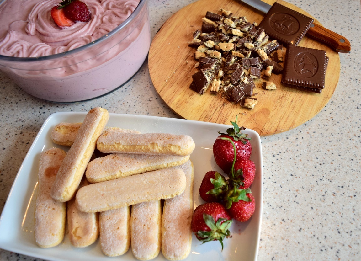 Inițial am vrut să pregătesc un tort cu pișcoturi și căpșuni. Am pregătit o cremă de căpșuni cu lapte condensat și mascarpone. Apoi am căutat în cămară și am găsit doar câteva pișcoturi, dar am descoperit și niște biscuiți cu glazură de ciocolată, uitați pe acolo. Așa că am combinat aceste trei ingrediente și a ieșit un desert tare gustos și de efect.